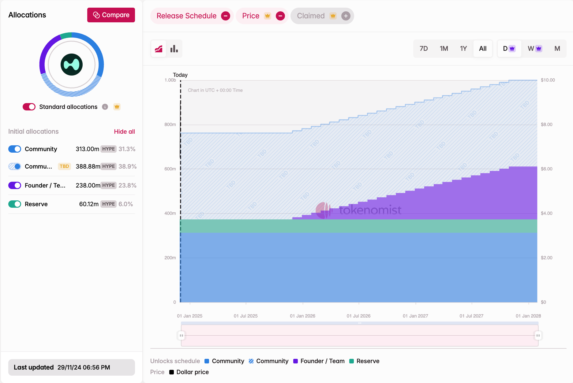 Hyperliquid’s supply schedule supports immediate liquidity with a high initial float while ensuring controlled emissions over time: