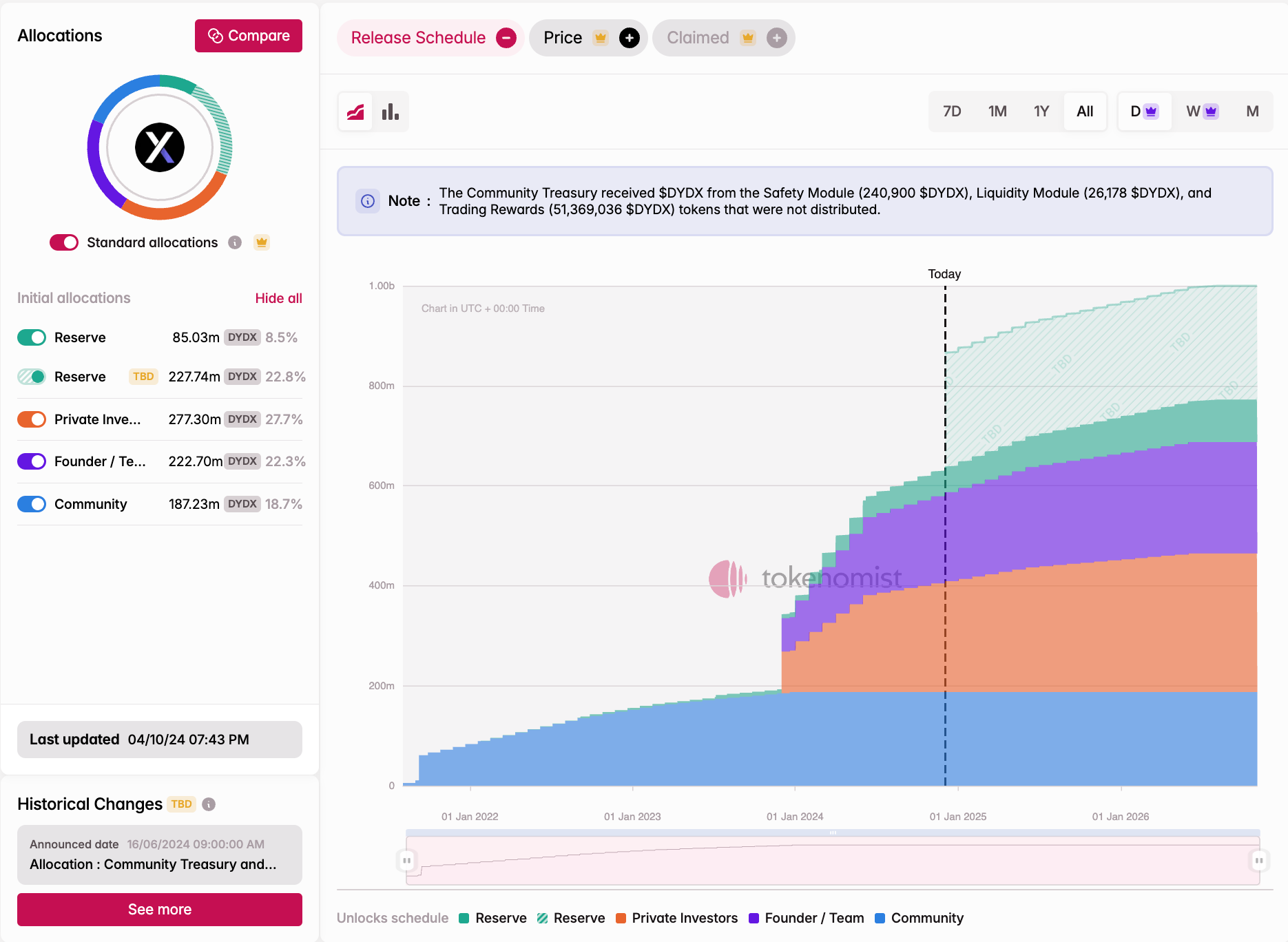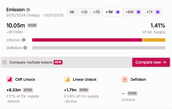 - Current token emissions are stagnant at ~80 million DYDX (<1% of total supply) per month, ensuring controlled supply growth.
