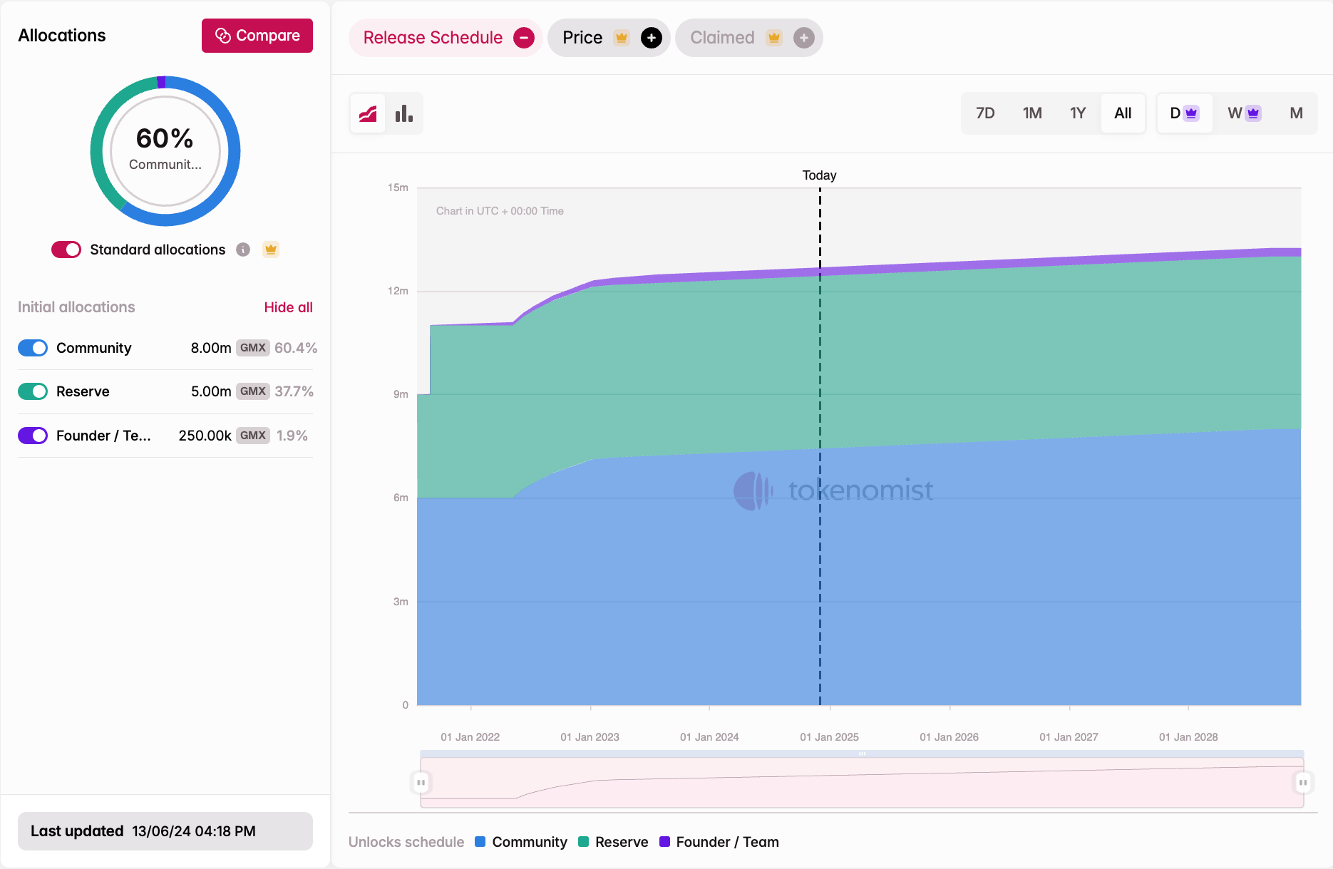 GMX launched in July 2021, transitioning from XVIX and Gambit tokens. Most of its token supply has already been unlocked, with remaining emissions primarily allocated as esGMX rewards under the community pool to incentivize protocol usage.
