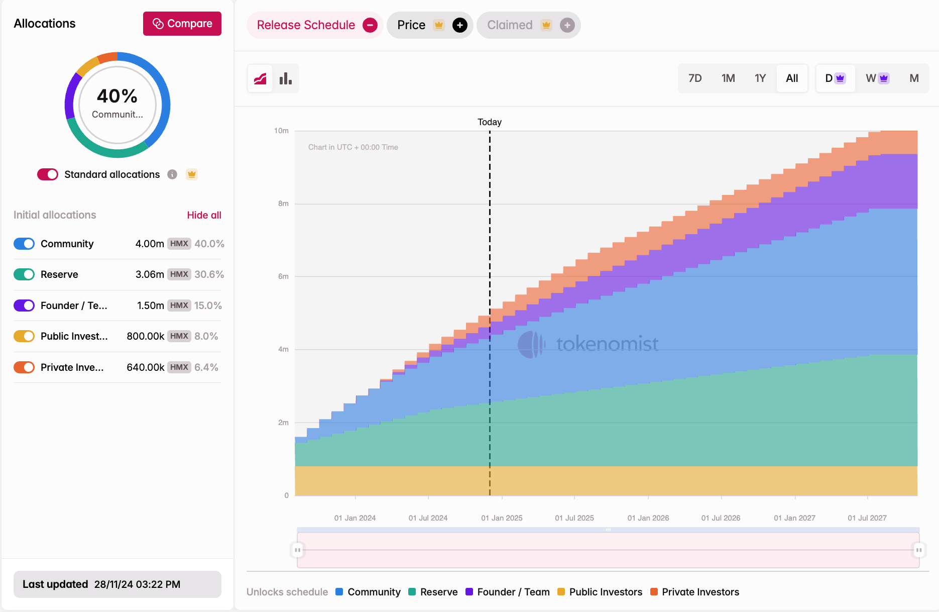 HMX launched in August 2023 with its Token Generation Event (TGE) through public sale.- Team and Private Investors: 6-month cliff followed by a 42-month unlock for the team and 12 months for investors.