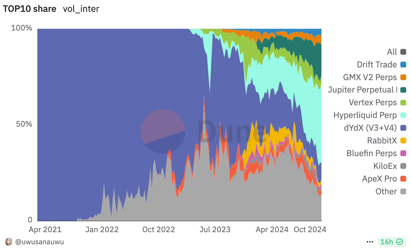 - dYdX (High Market Cap): An OG leader with a strong user base and a focus on the app-chain thesis.