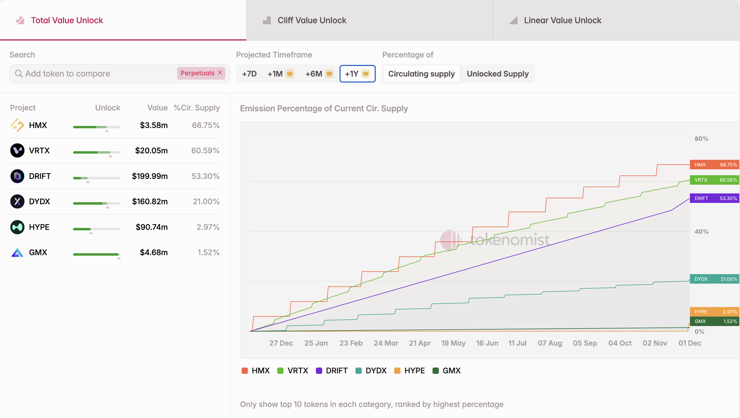 The perpetual protocol sector is gaining momentum in DeFi, led by innovative platforms like Hyperliquid, dYdX, GMX, and HMX, each driving growth through unique features and strategies. As this sector evolves, it’s set to play a pivotal role in decentralized trading. To explore more about these and other tokens in this category, please visit: https://tokenomist.ai/categories/Derivatives
