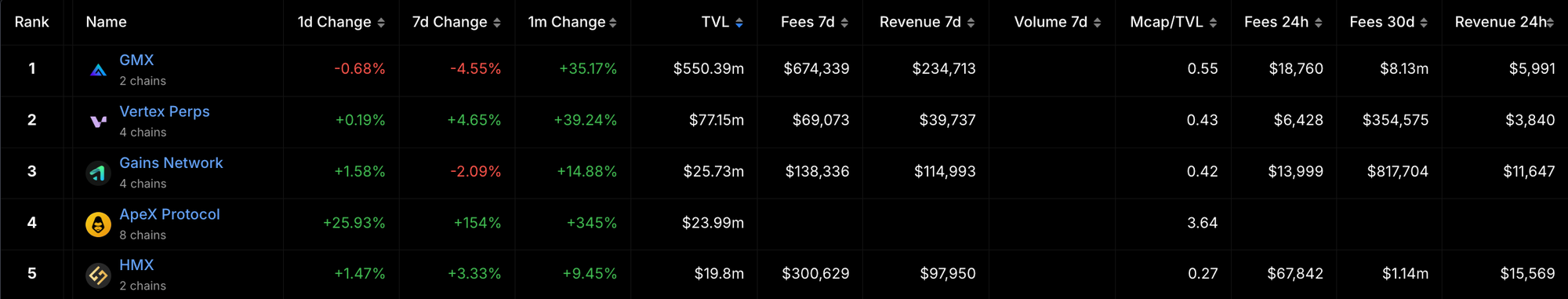 - High Fees and Revenue: HMX ranks #2 in fees and revenue despite lower TVL, showcasing strong user engagement and platform efficiency.