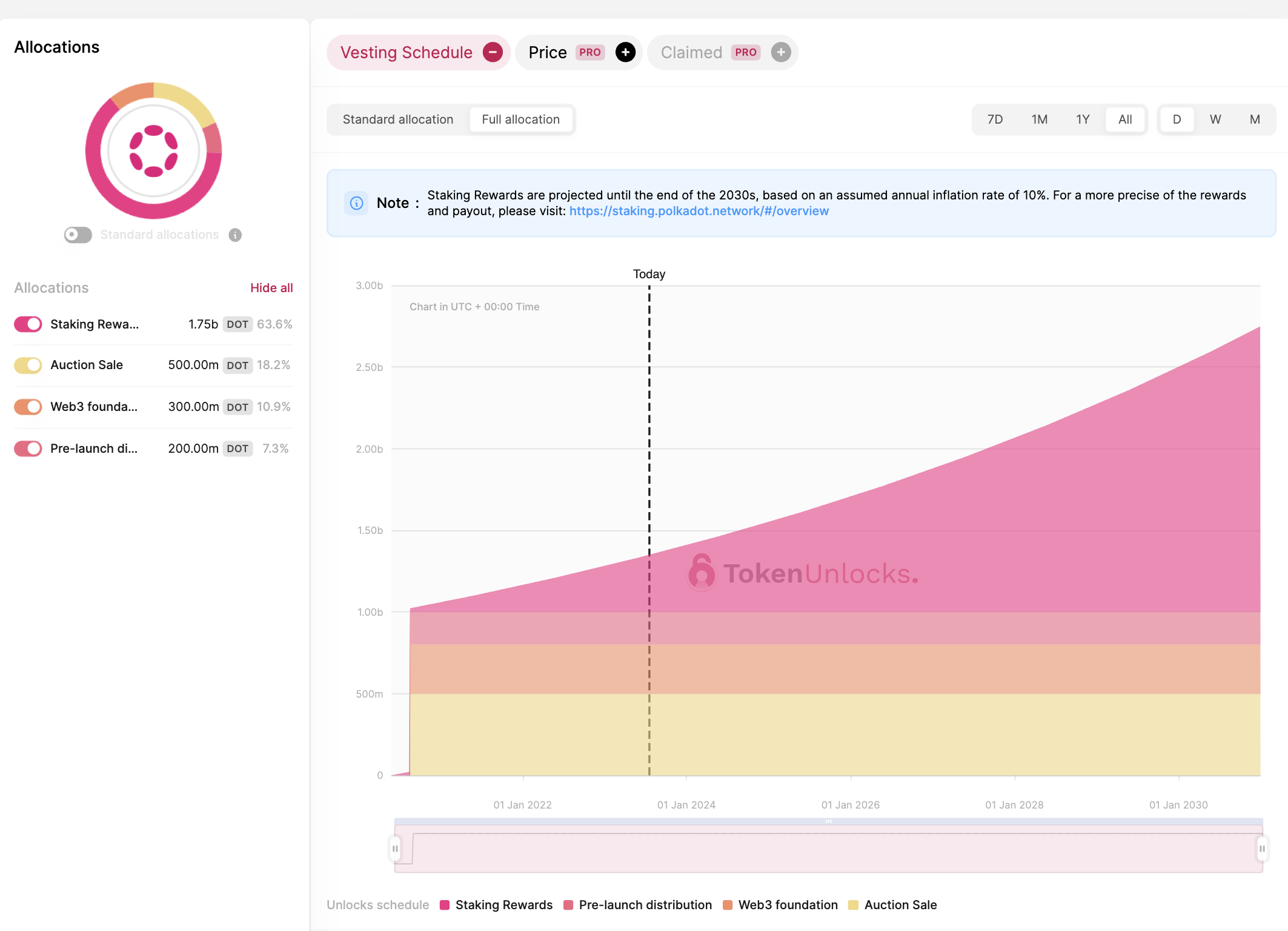 Polkadot was set to have a maximum supply of 1 billion $DOT tokens. However, this supply is not fixed and can be inflated over time, with the inflation rate determined by network governance. Currently, the circulating $DOT are estimated to be around 1.23 billion. The initial allocation of $DOT was distributed during the initial token sale (50%), retained by the Web3 Foundation for future use (30%), and given to the founders and early contributors to the project (20%).