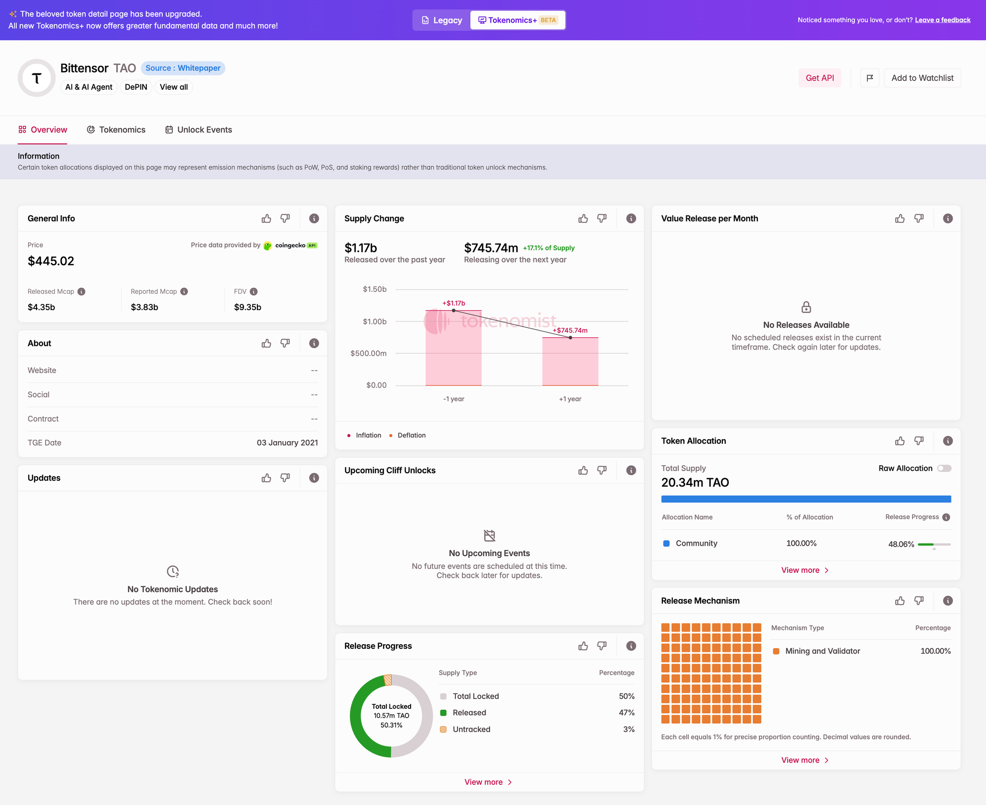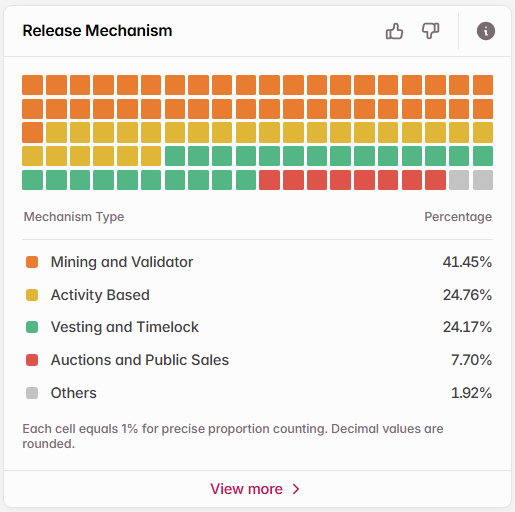The newly introduced release mechanism chart (BETA available to Pro users) breaks down how tokens are distributed — including mining, staking, activity-based rewards, yield farming, protocol incentives, auctions, and more. These tools make it easier to assess where inflation risk might arise and how token supply is structured over time.