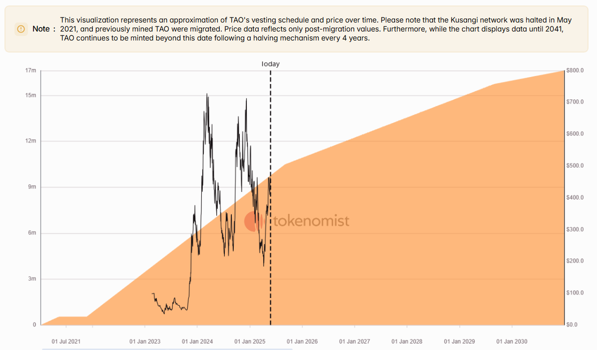In the case of Bittensor, Tokenomist has broken down TAO’s block reward emissions into a projected release schedule. This allows investors to estimate future supply changes with greater confidence, offering a clearer view of how its circulating supply will evolve over time—despite the absence of a formal unlock calendar.