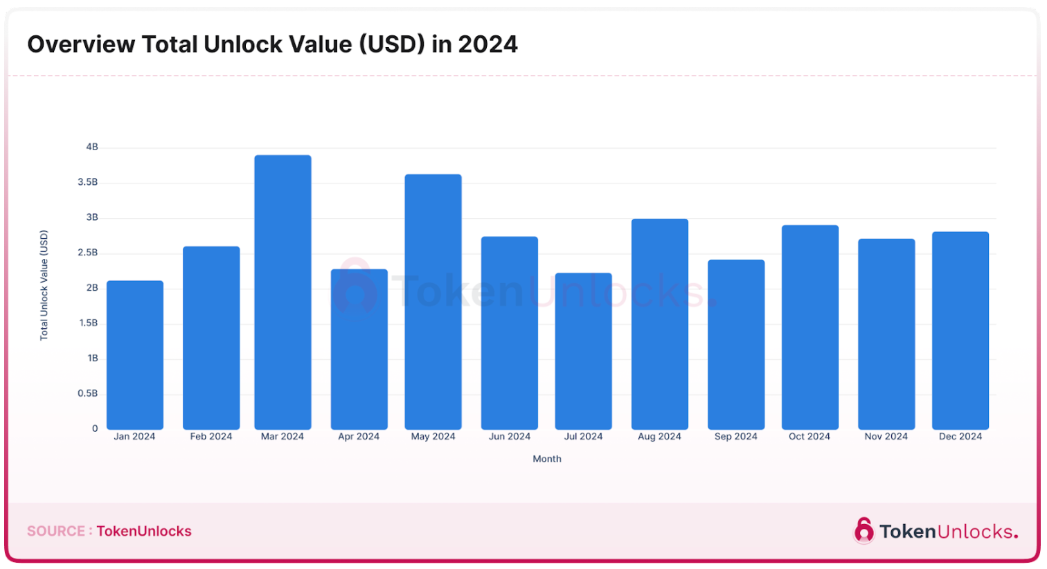 As illustrated in the bar chart below, March is set to be the peak month for total unlock value. For those interested in delving deeper into the 2024 unlock data, please click the link provided below for comprehensive insights.