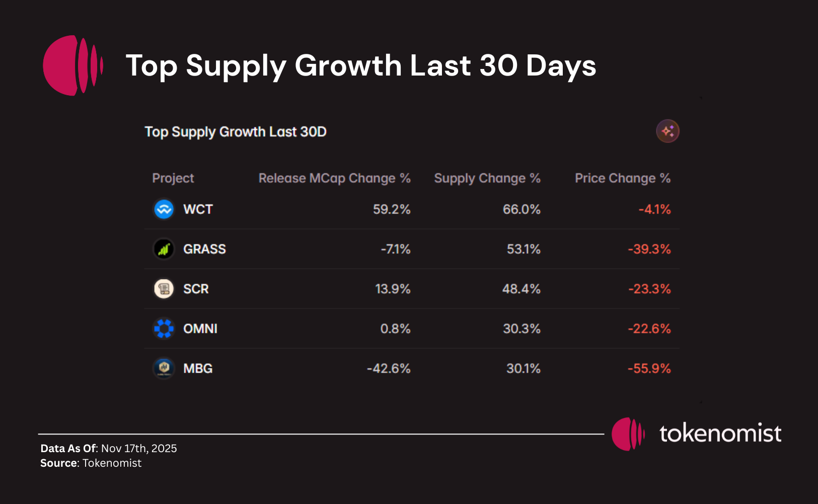 WCT, SCR, OMNI, GRASS and MBG all posted strong 30-day supply growth. WCT saw the biggest jump, with circulating supply up 66% over the month. GRASS, SCR, OMNI and MBG each added 30–53% new supply, with prices generally weaker where issuance was highest.