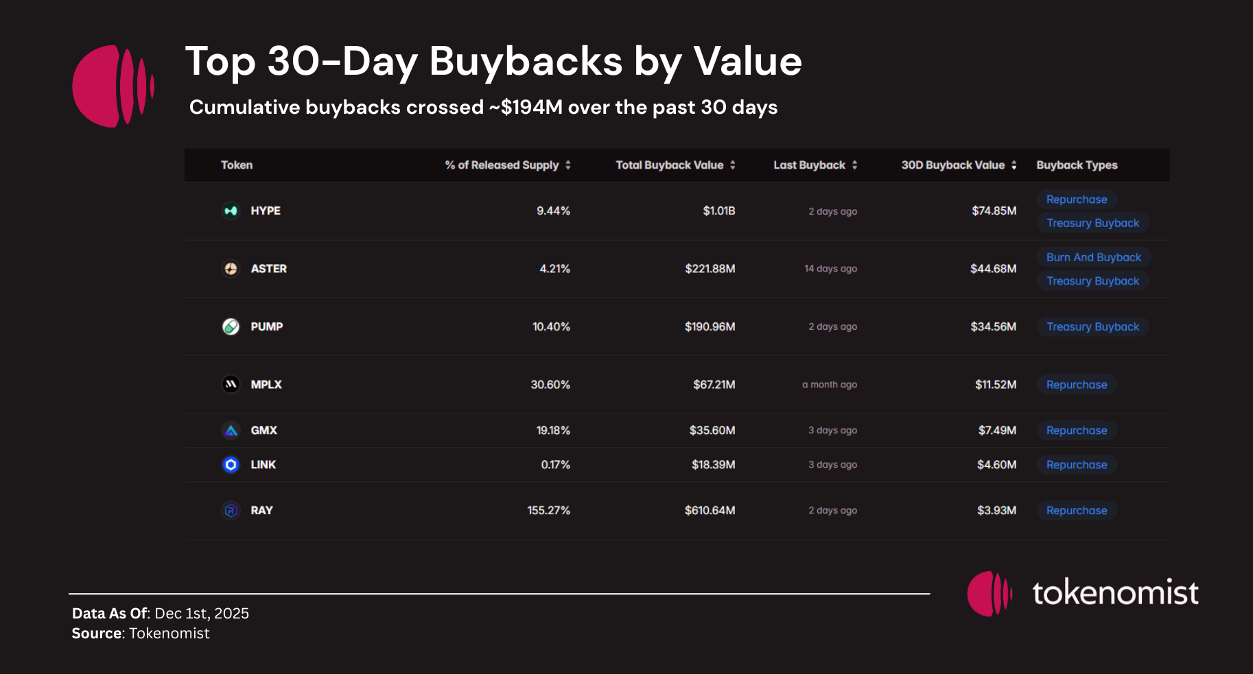 Cumulative 30D buyback activity surpassed $194M across major tokens.