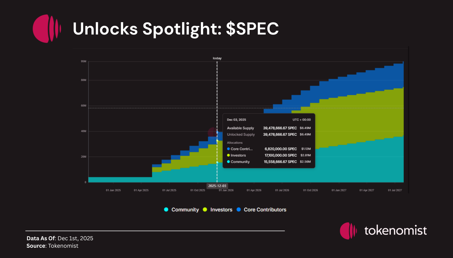 A sizable portion of $SPEC’s supply remains locked under a multi-year schedule, with team and investor allocations set to vest gradually over time. This week’s 10.10% unlock marks a sharp step-up in circulating supply, though the broader emission curve remains controlled.
