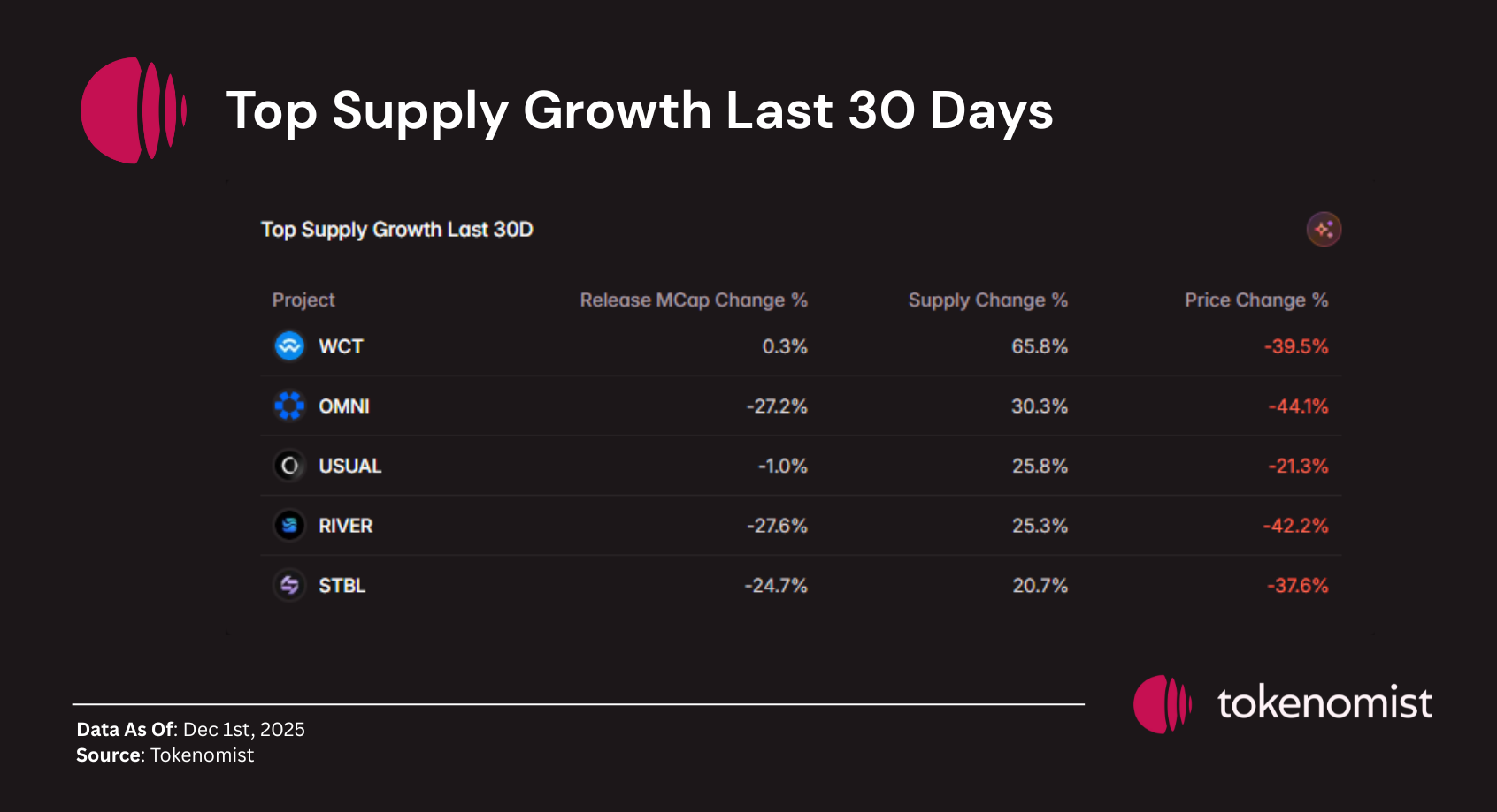 • WCT, OMNI, USUAL, RIVER, and STBL lead 30D supply growth, each posting 20–65% increases, largely driven by vesting rollouts rather than organic activity.