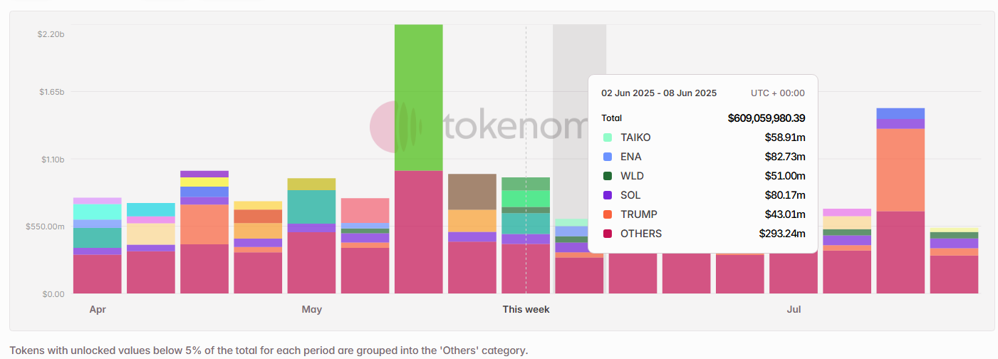 Next week’s scheduled token unlocks are set to surpass $600 Million in total value. Of this, approximately 23% is classified as insider unlocks under Tokenomist’s framework — referring to allocations designated for founders, core teams, or early investors. Notable tokens facing sizable releases by dollar value include $ENA, $SOL, $TAIKO, $WLD, and $TRUMP.