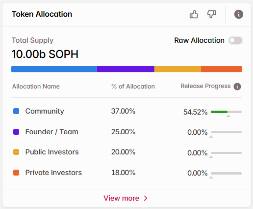 Tokenomics-wise, 37% of $SOPH’s total supply is allocated to the community, with more than half of that released at TGE — aligning with a strategy to build early user engagement. The launch featured an initial low float, with just 20% of the total supply unlocked at listing. Insider allocations are on a delayed schedule, with the first major unlock set to begin around one year from now, followed by a gradual vesting curve. This structure is designed to minimize immediate sell pressure from early backers while incentivizing long-term participation.