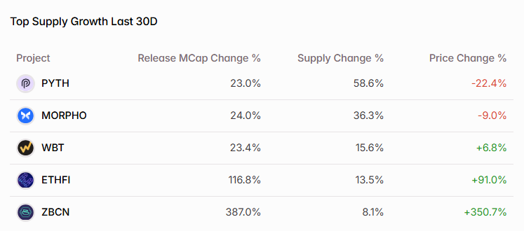 Over the past month, the impact of token unlocks on price performance has been mixed. Some tokens managed to hold or even gain value despite emissions, driven by strong demand or renewed narrative momentum. Others, however, struggled under selling pressure. The most notable example is $PYTH, which saw the steepest price decline following substantial unlocks — we covered this in detail last week (read the full breakdown here).
