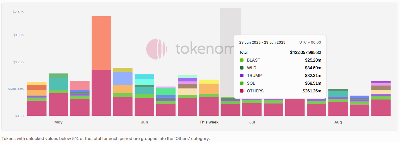 Next week’s scheduled token unlocks are set to be around $420 Million in total value. Of this, approximately 7.5% is classified as insider unlocks under Tokenomist’s framework — referring to allocations designated for founders, core teams, or early investors. Notable tokens facing sizable releases by dollar value include $SOL, $WLD, $TRUMP, $BLAST, and $SOON.