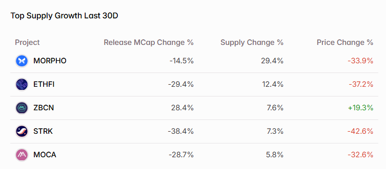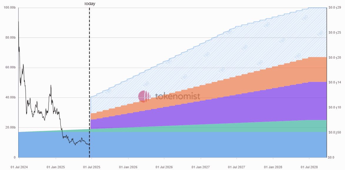 $BLAST tops next week’s calendar with the largest dollar‑value unlock and the highest percentage release relative to its circulating supply. This event marks the first cliff for insider allocations, releasing tokens reserved for private investors and the core team. Price action heading into the unlock is already weak—$BLAST is down more than 90 % from its all‑time high—so the market’s ability to absorb this new supply will be an early test of sentiment and liquidity for the project’s longer vesting schedule.