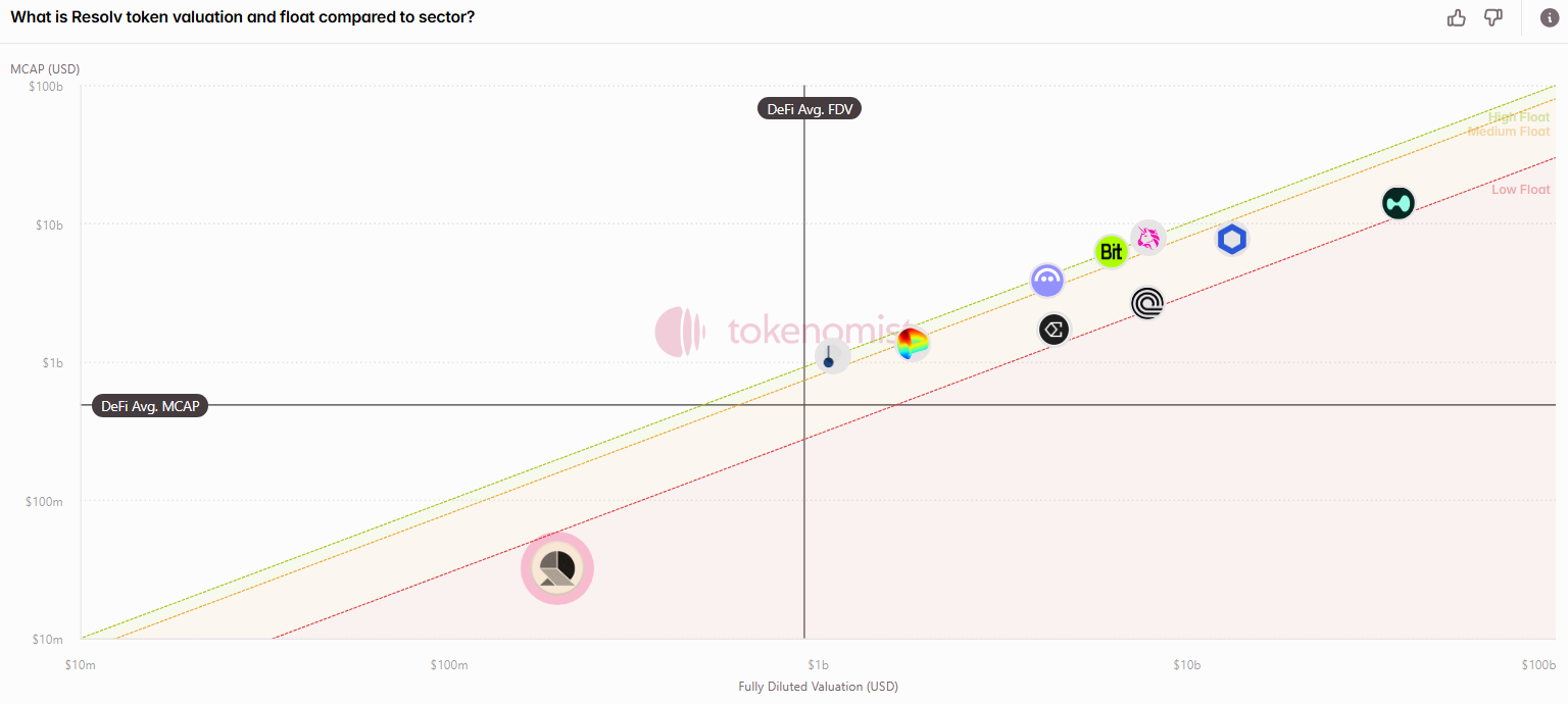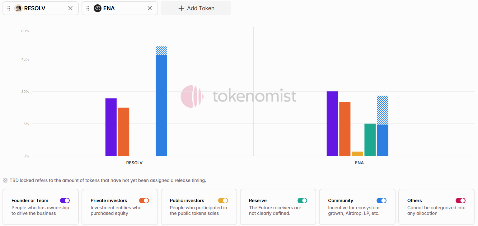 Compared to other DeFi projects, Resolv remains a small-cap protocol, operating with a low float and high FDV structure. When benchmarked against direct competitors like $ENA (Ethena), $ENA’s market cap is approximately 63 times larger. Both protocols allocate a similar percentage of tokens to insider cohorts, though Resolv has a slightly higher allocation to the community. This large valuation gap may be driven by Ethena's stronger traction and adoption of its USDe stablecoin, positioning $RESOLV as a higher-risk, earlier-stage alternative.
