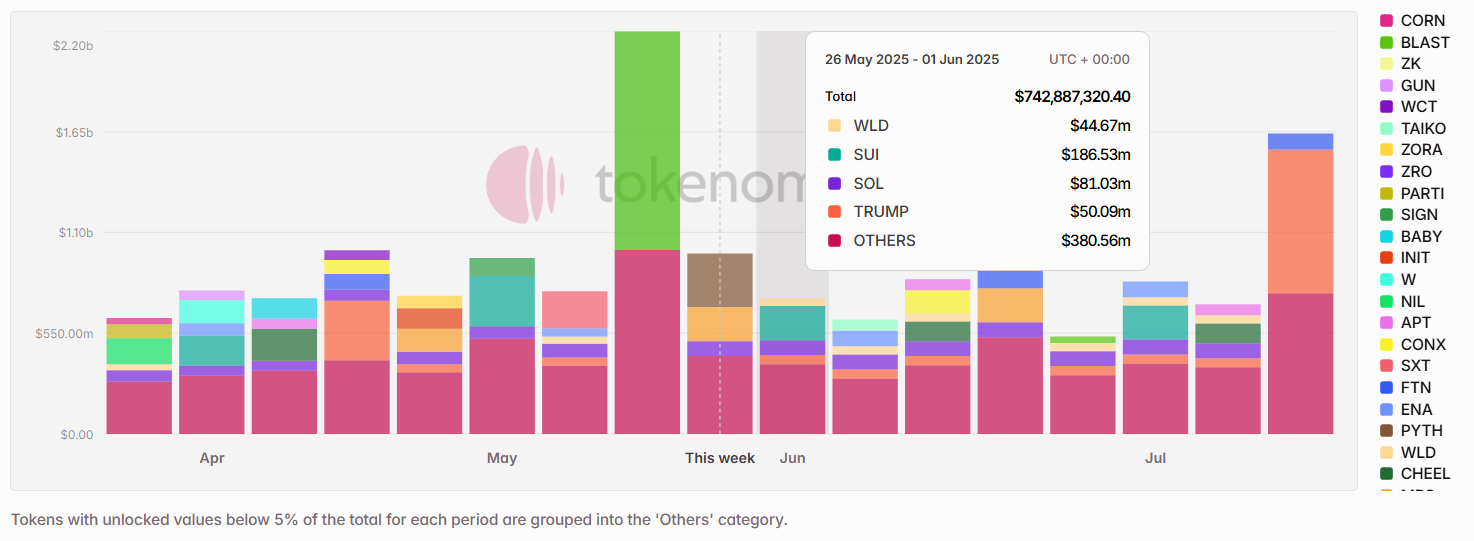 Next week’s scheduled token unlocks are set to surpass $740 Million in total value. Of this, approximately 26% is classified as insider unlocks under Tokenomist’s framework — referring to allocations designated for founders, core teams, or early investors. Notable tokens facing sizable releases by dollar value include $SUI, $SOL, $TRUMP, $WLD, and $BIO.