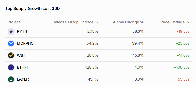 $PYTH stands out as notably underperforming over the last 30 days. More than 50% of its circulating supply has been released, contributing to a nearly 20% price decline during the period. While the majority of these tokens were directed toward the community, around 12% were allocated to insider group — a dynamic that may have added to selling pressure and raised concerns among investors.