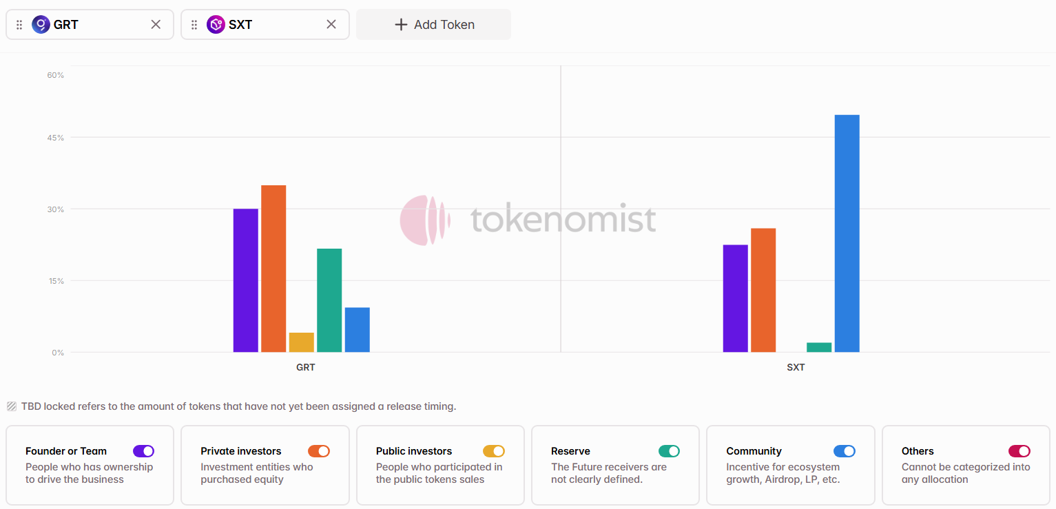 Compared to similar projects like The Graph ($GRT) — which is now trading at a $1 billion market cap — $SXT allocates a significantly larger share of its supply to the community, while reserving less for private investors and the team. This distribution approach may support broader user alignment early on, though long-term value capture will still depend on adoption and utility.