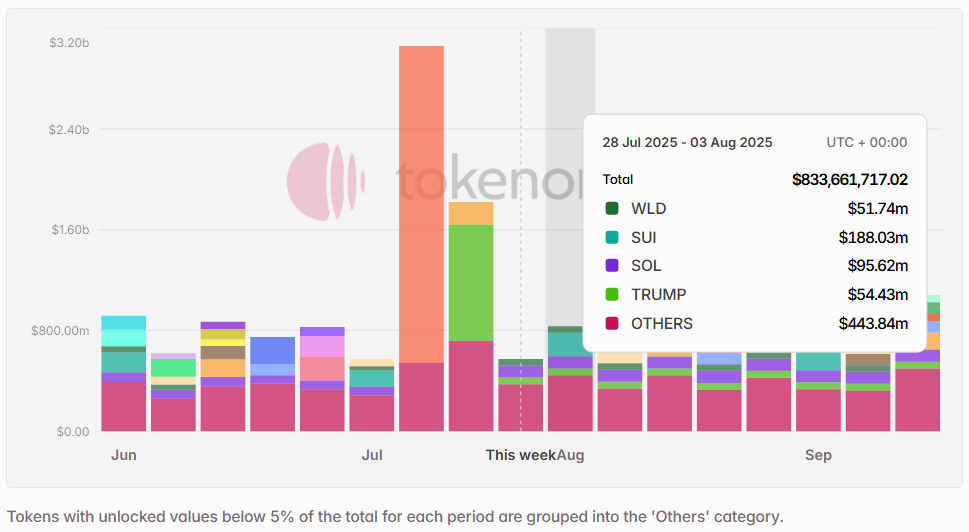 Next week’s scheduled token unlocks are set to exceed $833 Million in total value. Of this, approximately 21% is classified as insider unlocks under Tokenomist’s framework — referring to allocations designated for founders, core teams, or early investors. Notable tokens facing sizable releases by dollar value include $SUI, $SOL, $TRUMP, $WLD, and $JUP.
